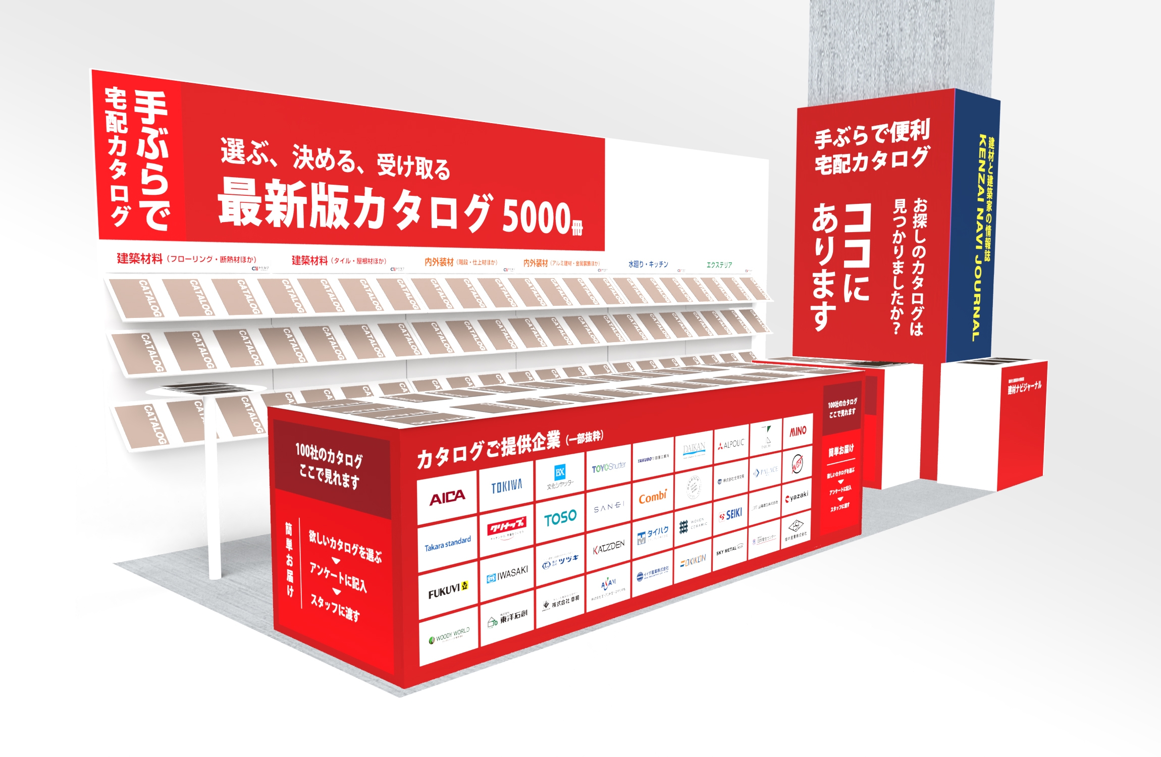 建材ナビブースでは、欲しいカタログを「選んで、決めて、宅配で受け取れます」。
