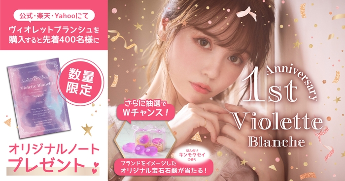 株式会社ビューフロンティアは、1月25日(火)〜2月14日(月)まで『Violette Blanche』を1箱以上ご購入いただいた方を対象に、抽選で30名様にオリジナル宝石石鹸、先着400名様にオリジナルノートをプレゼントいたします。