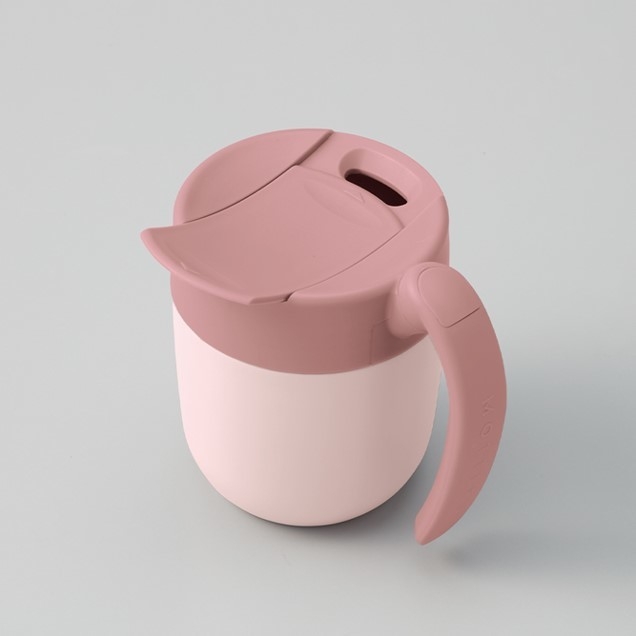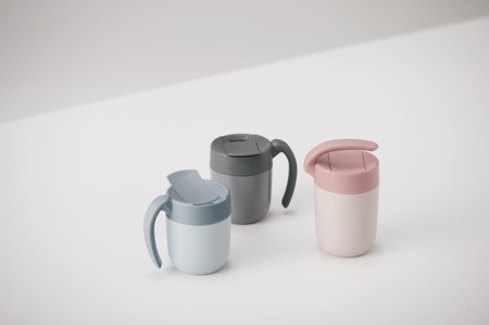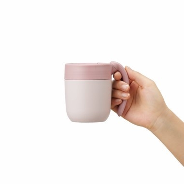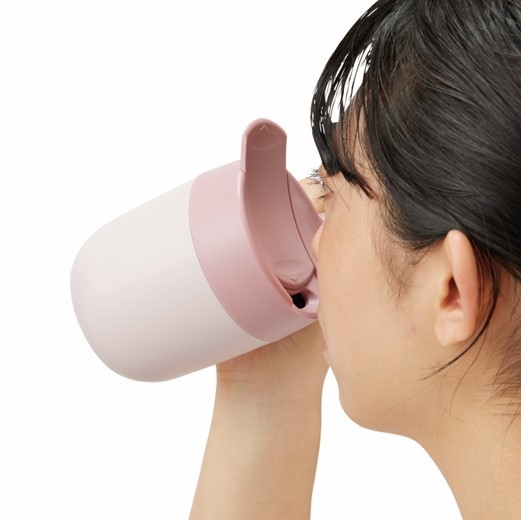 “くるっと”「ハンドル」を回すことで、利用シーンに合わせた使い方ができます。「ハンドル」を持ち運びしやすい位置に動かすことで、飲み物が入った状態でも安心して移動ができます。また、スライド式の蓋をずらすことで、両側2か所に飲み口ができる仕様の為、利き手に関係なく、ハンドルを掴み飲むことが可能です。本体カラーは、ジェンダーレスカラーを採用した4色です。