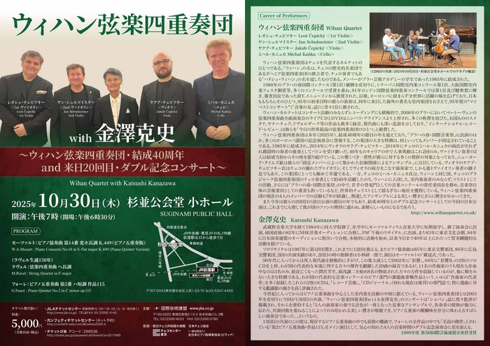 本年(2025年)、結成40周年の節目の年を迎えており、「プラハの春・国際音楽祭」に出演のほか、多くのヨーロッパ諸国の記念演奏会に登場する。この楽団の大きな特徴は、何といってもメンバーが固定されていることである。1985年に結成され、2014年にヴィオラのヤクブ・チェピツキー、2018年にチェロのミハル・カニュカの両氏がそれぞれ創設時の奏者の後釜としてバトンを受け継いだ。40年ものキャリアの中で人事異動はこれ2回のみ、ヴァイオリン奏者の2人は結成当初からその座を張り続けている。この驚くべき一貫性が彼らに対する多くの賛辞の対象となっており、ニューヨーク・タイムズ紙は彼らの「固定メンバーによって築かれた信頼関係によるアンサンブル」に注目している。ヴィオラのヤクブ・チェピツキー氏はチェコの優れたヴァイオリン、そしてヴィオラの両方をこなす演奏家で、しかも第1ヴァイオリン奏者の御子息でもあり、この楽団にとっても極めて幸運である。一方、チェロのミハル・カニュカ氏は、ウィハンと同じ国、チェコのプラジャーク弦楽四重奏団のチェロ奏者として約40年活躍したのち、ウィハンに入団した。室内楽奏者のみならず、ソリストとしての活動、さらには「プラハの春・国際音楽祭」の中で、若手の登竜門としての音楽コンクールの常任委員長を務め、音楽祭自体の芸術委員としての重責を担っているなど、世界的チェリストとして揺るぎない地位を獲得している。