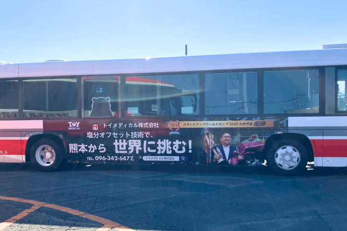 塩分の過剰摂取問題の課題解決に取り組むトイメディカル株式会社(本社:熊本県熊本市、代表取締役社長:竹下英徳)は、今年5月に開催された「スタートアップワールドカップ2025九州大会」での優勝を記念し、8月1日より熊本市内を走る熊本バスにラッピング広告を開始いたしました。