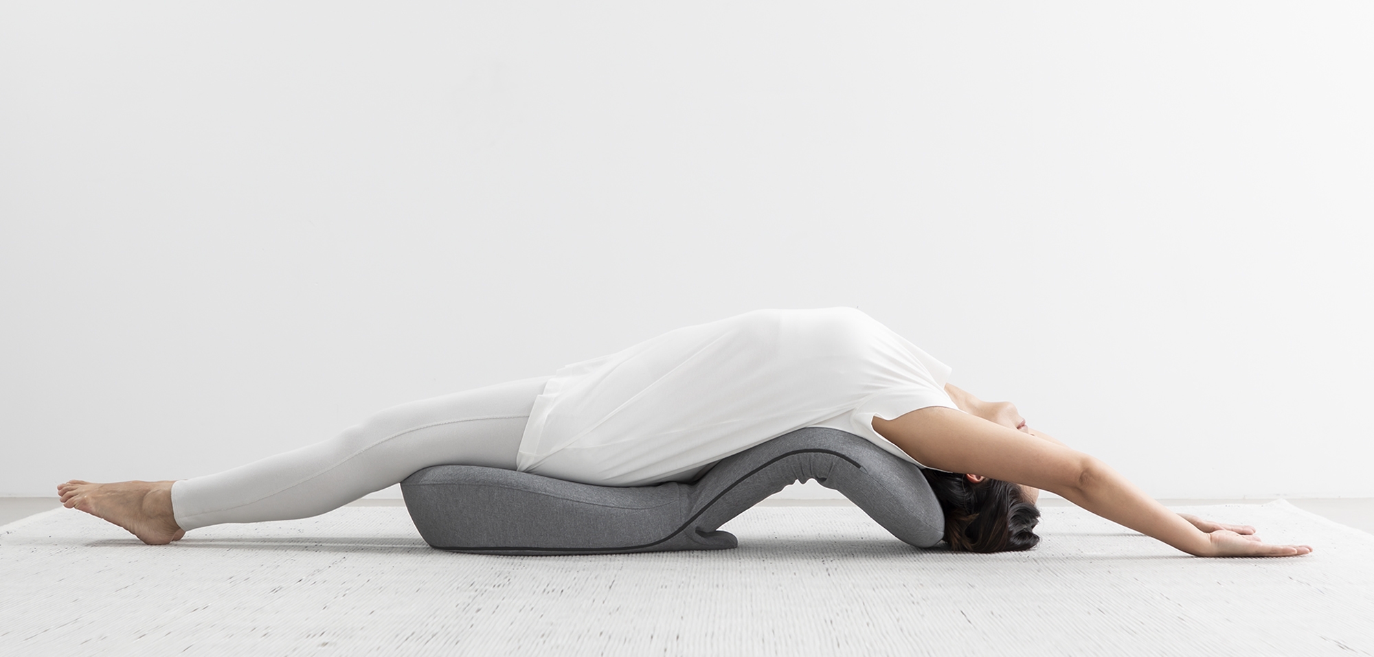 STRETCH CHAIRは、全身を伸ばしたストレッチが手軽にできる座椅子です。腰と背中の2ヶ所に搭載したリクライニングギアがそれぞれ14段階に可動し、好みのストレッチ角度へと変形。背中を反って身体を後ろに預けると、自然と胸が大きく開いて身体の緊張がほどけ、心身ともにリフレッシュできます。リクライニングの角度を変えればストレッチの強度も調整可能。
