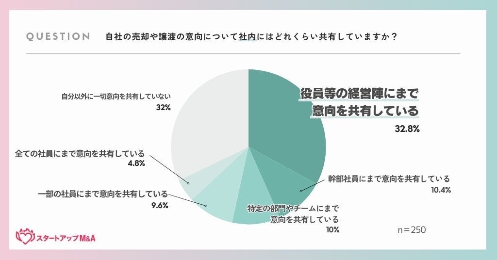 次に、「自社の売却やM&Aによるイグジットの意向について社内にはどれくらい共有していますか?」といった質問をしたところ、役員等の経営陣にまで意向を共有している企業が32.8%と最多となりました。