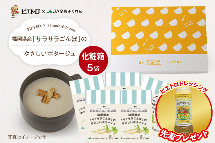 対象商品は、共同開発したオリジナルポタージュの他、株式会社ピエトロで現在販売している、福岡や九州の野菜やお肉を使用したスープやカレーを詰め合わせた、生産者、ピエトロ、JA全農ふくれんの想いが詰まった商品です。