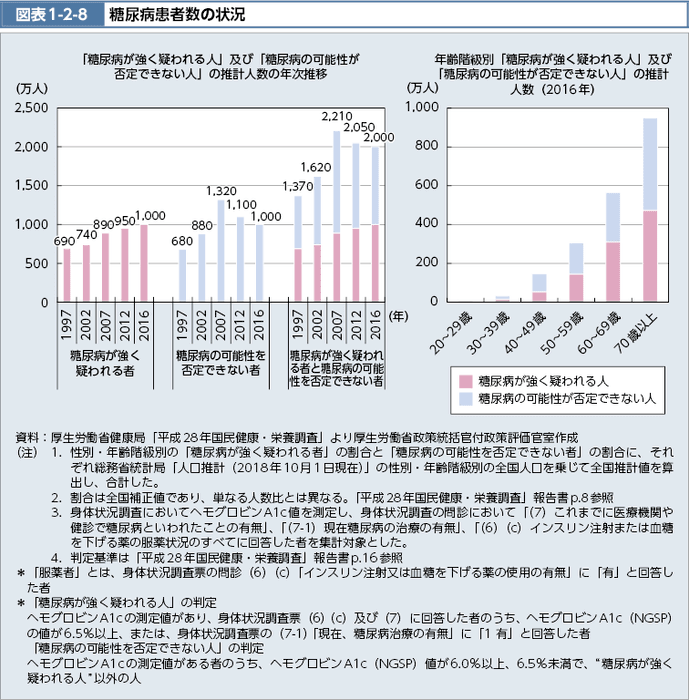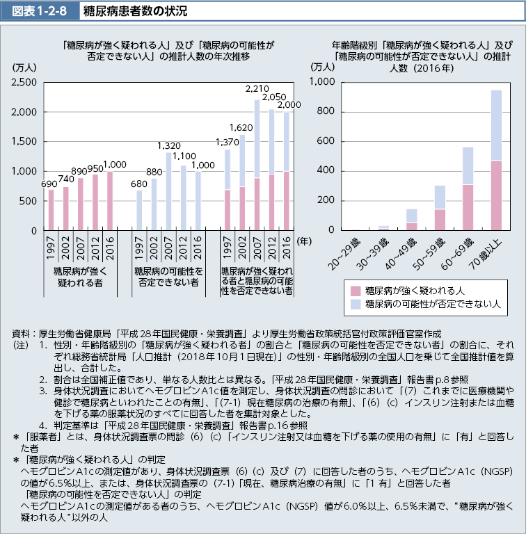 日本人の多くは2型であり、2016年国民健康・栄養調査によると糖尿病と強く疑われる人と可能性を否定できない人は、約2、000万人となっております。