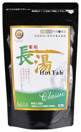 薬⽤⻑湯ホットタブClassicは、当社が独⾃技術で開発した、家庭で重炭酸温浴を楽しめる⼊浴剤『ホットタブ』をベースに、さらなる温浴効果の向上を追及し⻑湯温泉のある⽵⽥市と共同開発した製品です。