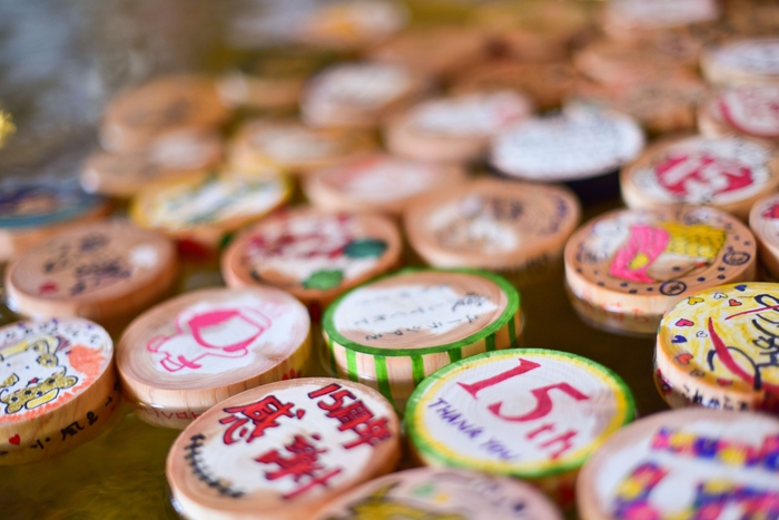 男女内風呂に、15周年の感謝をこめたメッセージ入りのひのきを浮かべます。