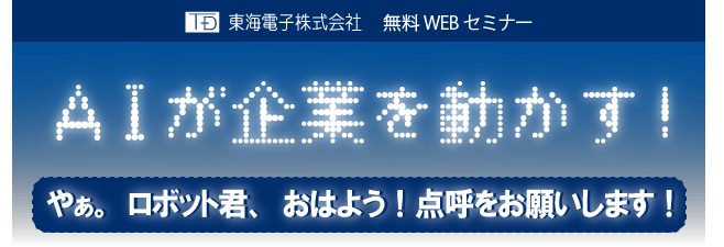 点呼機器およびアルコール検知器を開発・販売する東海電子株式会社(本社:静岡県富士市 代表取締役:杉本 哲也)は、 この度、 「AIが企業を動かす!皆様でロボット点呼に必要な機能を決定しませんかセミナー」(無料)を7月15日(木)と7月27日(火)に開催いたします。