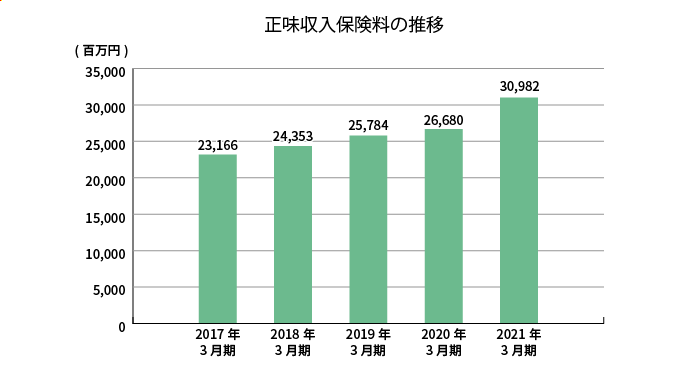コロナ禍でのオンラインビジネスの好調トレンドや主力商品である自動車保険の販売が伸びた結果を受け、元受正味保険料(※1)が45,712百万円(対前期比17.2%増)、正味収入保険料(※2)が30,982百万円(同16.1%増)、保険引受収益が30,997百万円(同15.8%増)となり、経常収益は32,737百万円(同13.6%増)となりました。