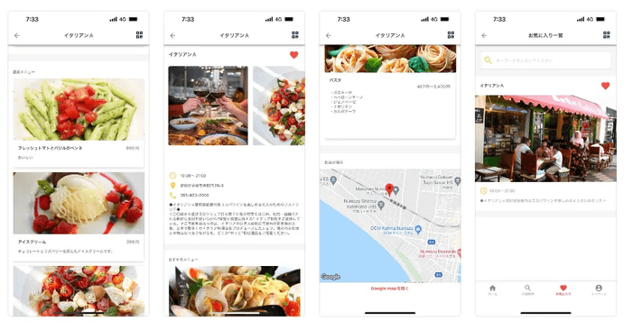 ログイン、新規登録、店舗情報の一覧、詳細、フリーワード検索、お気に入り登録、マップ表示、マイページ・・・