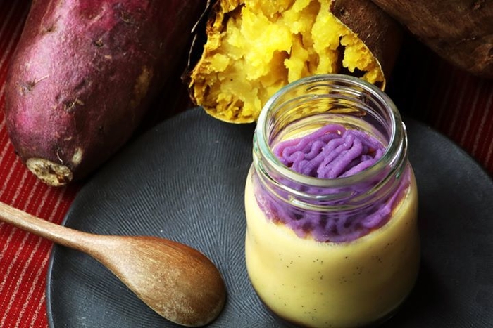 ペースト状にしたおいもをプリンに練りこみプリン全体をお芋味にするだけでなく、彩りと一口目の香りを引き出すため、プリンの上に紫芋のペーストを、そしてプリンの中にはカラメル風味の焼き芋を忍ばせることで、お芋の香りとホクホク感、プリンのなめらかさとバニラの香りを楽しめるプリンになっています。