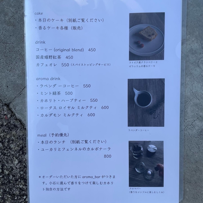 アロマ喫茶カホリトのメニューには、もれなく香りを選べる無料のアロマ小石「アロマバー」が付いてきます。9種類の天然香からお選びください。