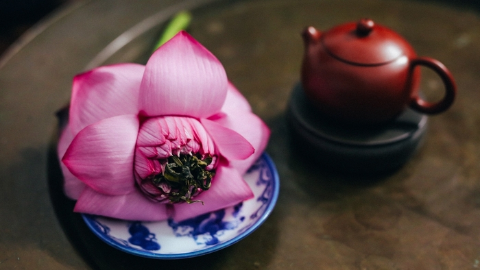 『朝蓮を摘み取り、昼に開いている蓮の花に茶葉を詰め、夜に花が閉じ香りが茶葉にうつる。そして、翌朝に茶葉を取り出しお茶で頂く』という文献を紐解き作り上げました。
