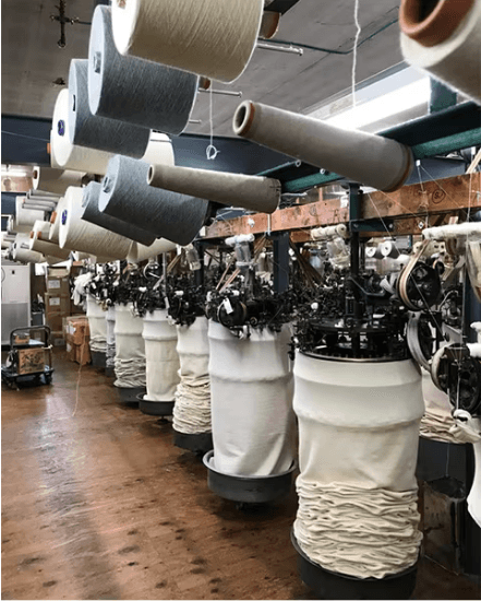 この『吊り編み機』では、糸の持ち味を壊さず、編み目にゆとりを持たせながら、ゆっくりと時間をかけて丁寧に編み上げていくため、まるで手編みのような独特の風合いを持つ生地を生産することができます。