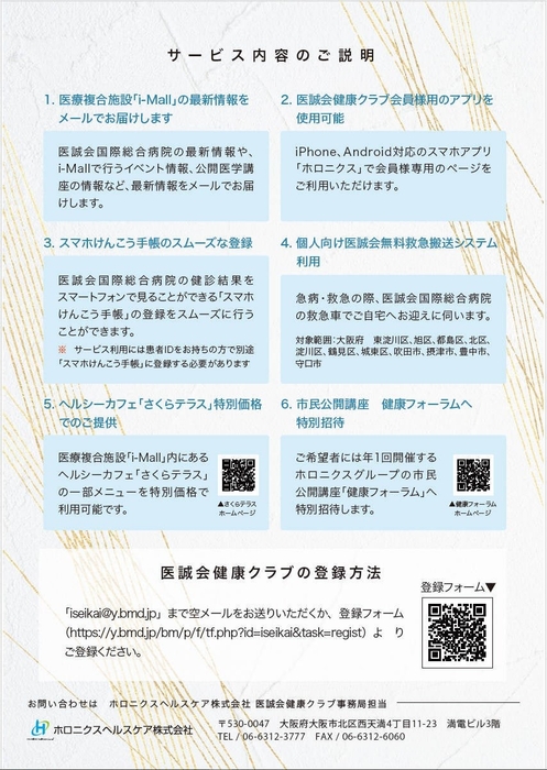 医療法人医誠会(本社:大阪府大阪市、代表者:谷 幸治)が運営する医誠会国際総合病院を含む医療複合施設「i-Mall」では、2024年1月よりi-Mallを便利にお得に利用できる会員サービス「医誠会健康クラブ」(運営会社:ホロニクスヘルスケア株式会社)のサービス内容をリニューアルしました。これまでのサービスをバージョンアップし、医誠会国際総合病院に適した新たな特典を追加。より多くの皆さまに、より便利でお得にi-Mallをご利用いただけるようになります。
