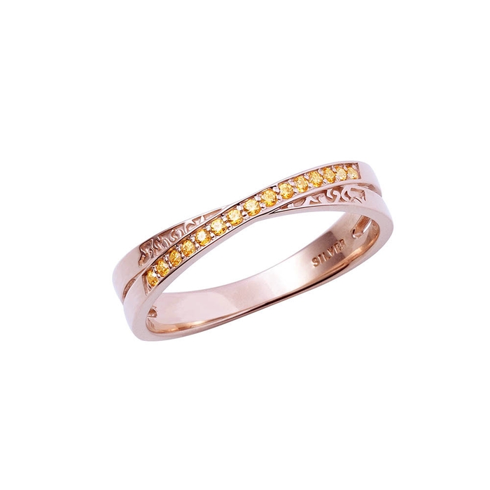 川端の指環(鞭)はレトロなピンクゴールドコーティングを施した透かし柄の型に、イメージカラーストーンをウェーブ状に配しました。手元が華やかになるデザインです。