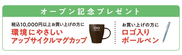 オープンを記念し、税込10,000円以上お買い上げの方に環境にやさしいアップサイクルマグカップを、また、お買い上げの方にオリジナルボールペンをプレゼントいたします! ※大津京店のみ。無くなり次第終了となります。