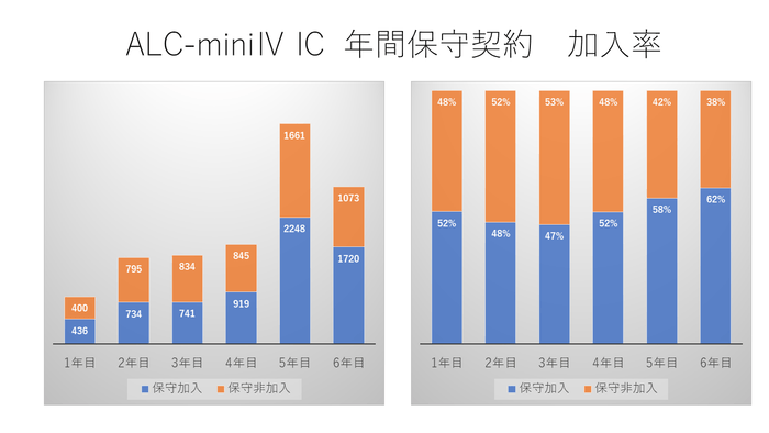 本製品ALC-miniⅣ ICは、企業向けに保守契約をご提供しております。道路交通法によるアルコール検知器の使⽤義務ということもあり、保守契約に加⼊する企業が増えつつあり、ほぼ半数以上が故障対応時等に備え、保守契約に加⼊されています。