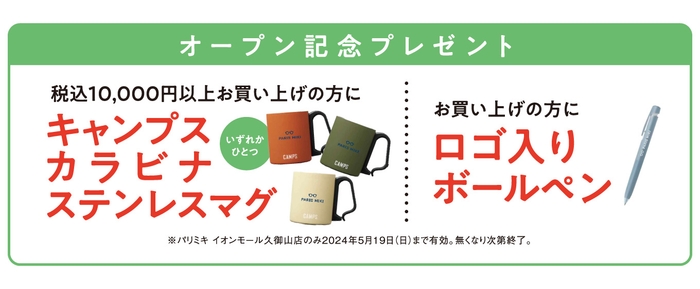 オープンを記念し、税込10,000円以上お買い上げの方にオリジナルステンレスマグを、期間中お買い上げの方にオリジナルボールペンをプレゼントいたします!