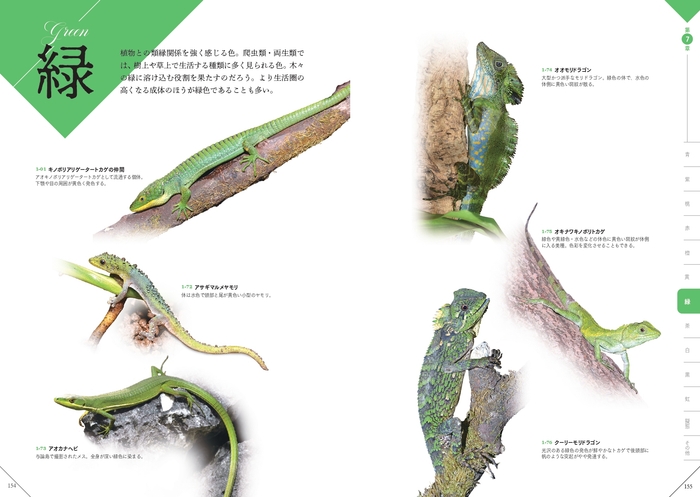 本書は、色彩別に爬虫類・両生類をカテゴライズした図鑑です。
