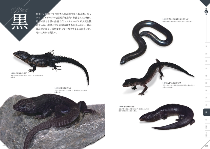 美しい爬虫類・両生類の写真ともに品種(モルフ)名や一言解説を掲載。