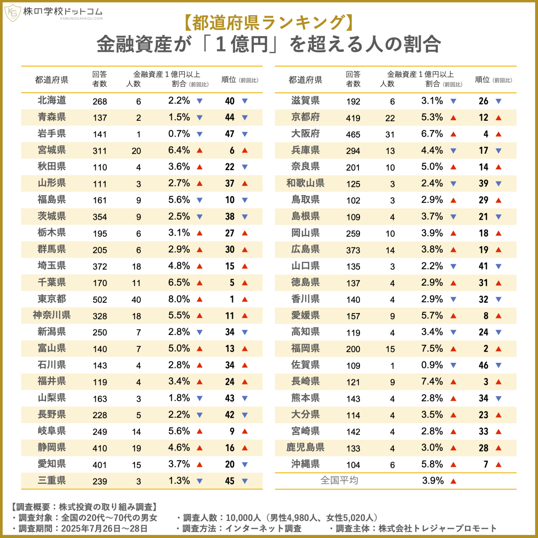 2位以降は、福岡県の7.5%、長崎県の7.4%、大阪府の6.7%、千葉県の6.5%が上位に入りました。前回調査(2024年7月)と比較すると、金融資産1億円以上の人の割合は全国平均では0.9ポイント増え、30の都府県でも前回を上回りました。