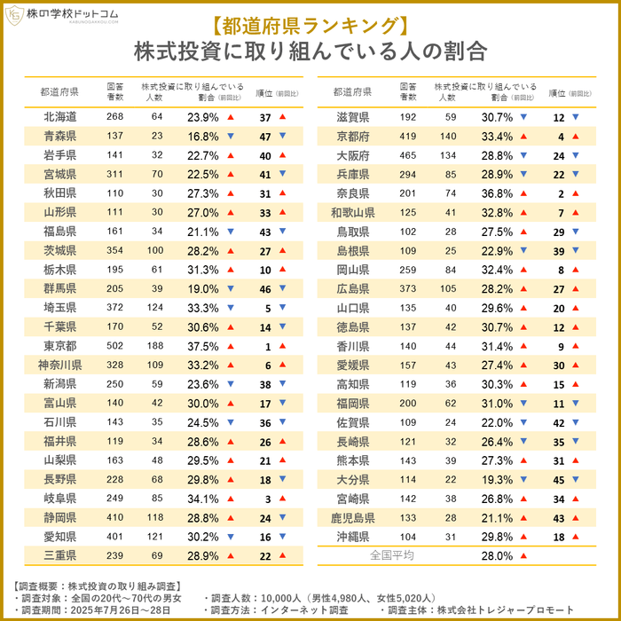 インターネットのアンケート調査を活用して、全国の1万人(20〜70代)に対して「あなたは株式投資に取り組んでいますか?」という質問をしたところ、「はい」と回答した人は、47都道府県の平均は28.0%でした(各都道府県の数値を合計し47で割って算出。以下同様)。