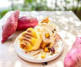 TAMAGOYA自慢のふわふわパンケーキの上に三島甘藷のスイートポテトクリームを絞って、仕上げました。まろやかな三島甘藷とほどよい甘さの生クリームは相性ピッタリです。トッピングは、伊豆・村の駅の契約生産者さんのお芋を使用して作った大学芋をごろっごろっとのせました。塩キャラメルソースがアクセントになったお芋のおいしさを満喫できるパンケーキです。