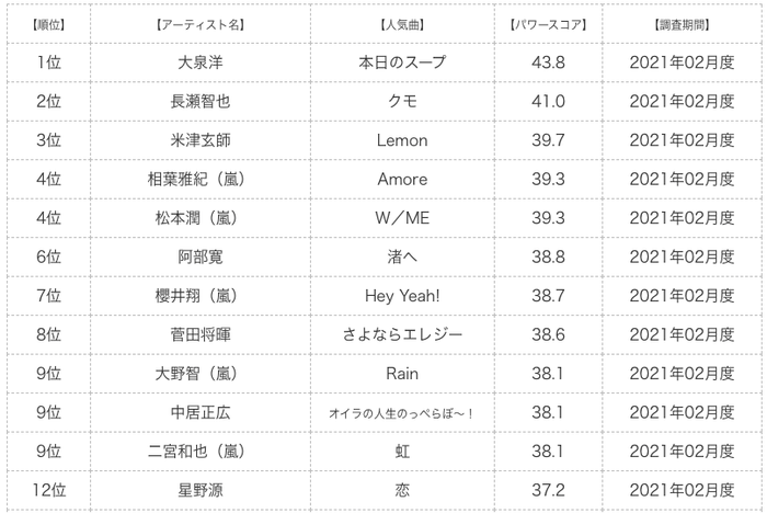 『タレントパワーランキング』では、タレントパワーランキングに登録されているソロ男性アーティストのパワースコアを調査。