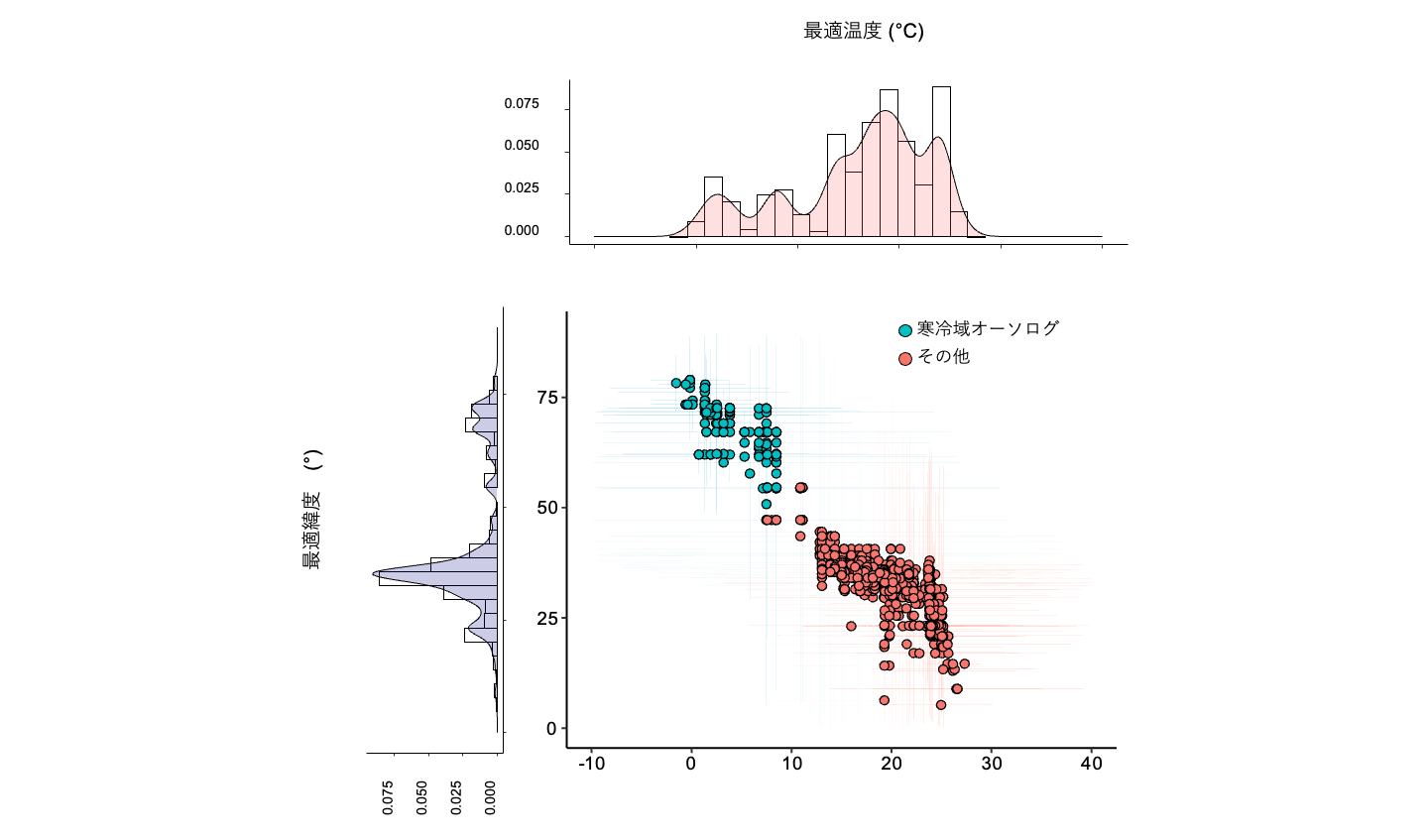 これをもとに、研究チームは、京都大学が開発するKEGGデータベースを利用し、ウイルス遺伝子の機能を予測しました。そして、それぞれの種類の遺伝子がどのような温度域・緯度域に分布しているかを示しました。