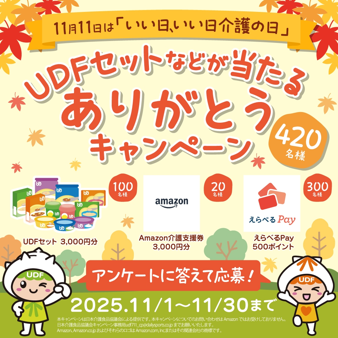 日本介護食品協議会(所在地:東京都千代田区、会長:森 佳光)は、2025年11月1日(土)より『11月11日は「いい日、いい日介護の日」 UDFセットなどが420名様に当たる ありがとうキャンペーン』を開催します。