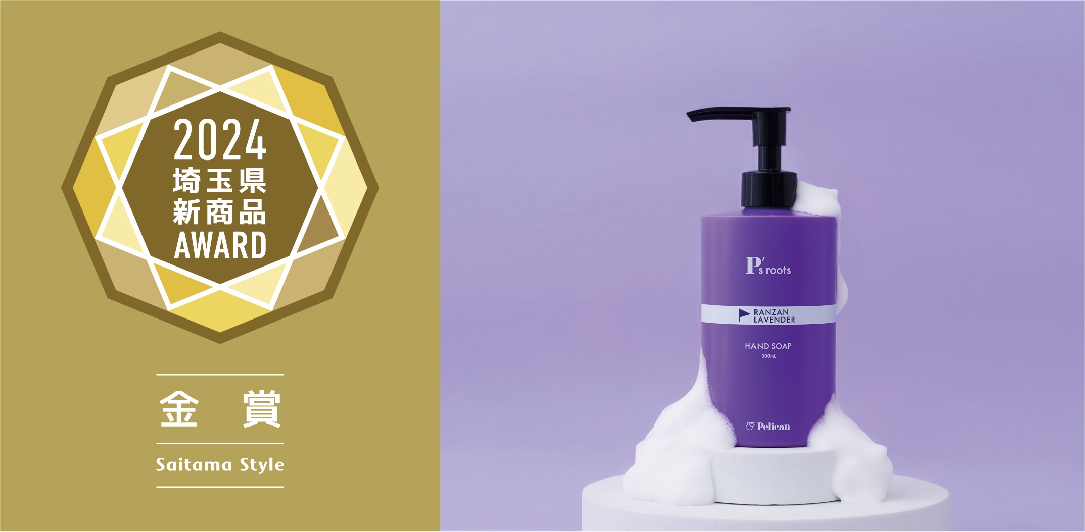 第5回となる2024年度「埼玉県新商品AWARD」では、2023年9月2日(土)~2024年9月1日(日)の期間に新発売された商品を対象に、49アイテム(工芸・雑貨カテゴリー 17点、食品カテゴリー 32点)がエントリー。その中から、工芸・雑貨カテゴリーにて『P's roots』シリーズの『茶葉・ビタミンC洗顔パウダー』が大賞に、『ラベンダーハンドソープ』が金賞に選定されました。天然素材を活かした、心にもお肌にもやさしいペリカン石鹸のモノづくりが高い評価を得ました。