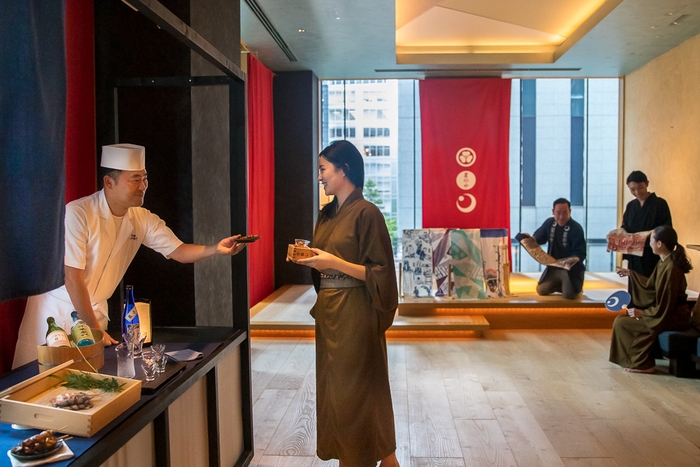 「東京・夏夜の宴」の開催期間の中で、8月5日から16日までの間、江戸時代に発展した文化にルーツがあり、今もなお、こだわりを持ちながら商いを続けている老舗が毎日1店舗日替わりで星のや東京に出店します。宿泊者は、オリジナルメニューの振る舞いや伝統工芸体験、そして店主や職人との交流など、長い時間守り続けてきたお店の文化や伝統、こだわりを学べます。お店の文化や伝統を聞きながら、こだわりの料理を食べ、工芸に触れることで、お店でも体験することのできない「お江戸楽市」ならではの楽しみ方ができます。