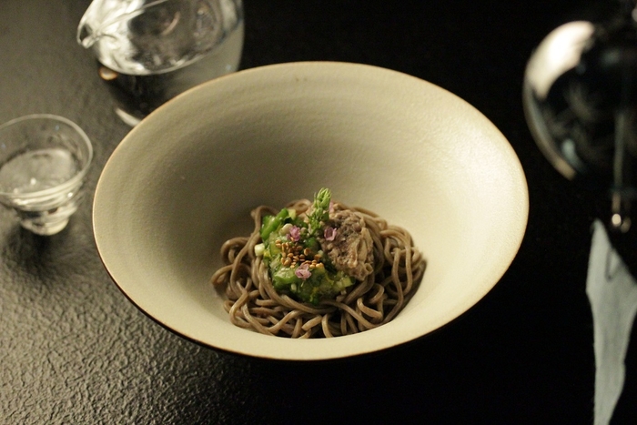 江戸時代、風鈴を付けて夜食用の蕎麦を売り歩いていた屋台が街には多くあり、風鈴の音を聞きつけた江戸の街の人々は、夜が更けてから酒を呑み、蕎麦を楽しんでいました。「東京・夏夜の宴」では、江戸の人々の粋な文化に倣い、星のや東京の1階にある立ち食い蕎麦屋「港屋2」で、強いコシと豊かな風味が特徴の蕎麦と夏の旬の食材を組み合わせた「風鈴そば」を宿泊者限定で提供します。港屋2の蕎麦にあわせるのは、ミョウガや大葉などの薬味とキュウリやナスといった夏野菜の出汁、江戸の人々が夏に好んで食べていたといわれる鯖です。一般的に鯖と言えば、秋鯖を連想しますが、歳時記では鯖は夏の季語で、江戸時代料理書でも夏の献立に鯖が使われています。(*)風鈴の音を聞きながら、黒い御影石のテーブルや照度を抑えた照明が特徴の空間で、冷えた日本酒とともに、暑い夜にぴったりのさっぱりとした「風鈴そば」を楽しめます。