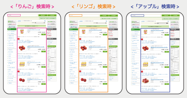 例:「リンゴ」「りんご」「リンゴ」「アップル」など、異なる表記でも同じ検索結果が表示される