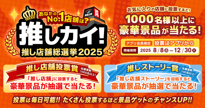 このたび2025年8月8日(金)~2025年12月30日(火)の期間、買取王国とその他関連店舗の中からお気に入り店舗を投票していただき、人気NO.1店舗を決定する「推しカイ!〜推し店舗総選挙2025〜」を開催します!