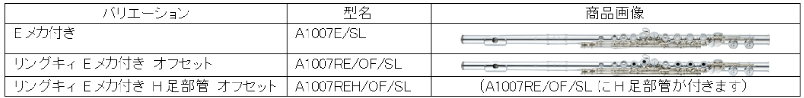 「A1007/SL シリーズ」は暖かく力強い鳴りが魅力で、幅広い音楽シーンに対応。趣味の室内楽で演奏される方や、大編成の合奏でもしっかりと音を主張させたい吹奏楽部の中高生など、様々な方にフルート演奏を心から楽しんでいただけるモデルです。カバードキィタイプの『A1007E/SL』のほか、リングキィタイプでオフセットの『A1007RE/OF/SL』 、A1007RE/OF/SLにH足部管を採用した『A1007REH/OF/SL』 の3種をラインアップしています。