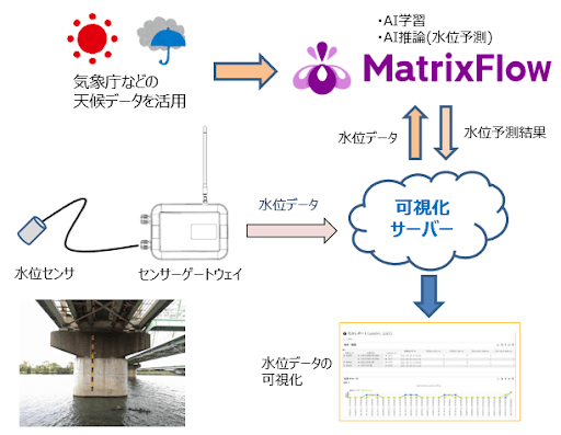 上記背景より、三信電気株式会社と株式会社MatrixFlowは、水位センサから送られてくるリアルタイムの水位データ、過去の雨量などの気象実績データ、及び気象予報データを用いた機械学習により、「水位予測AIソリューション」を共同で構築しました。