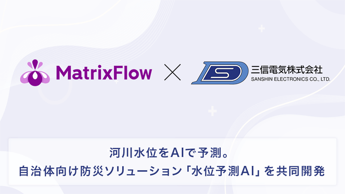 株式会社MatrixFlow(本社:東京都台東区 代表取締役 田本 芳文)は、"エレクトロニクスの総合商社"である三信電気株式会社(証券コード:8150 本社:東京都港区 代表取締役社長執行役員 鈴木 俊郎)と提携して、全国の自治体向けに、電子機器とAI活用プラットフォーム「MatrixFlow」を活用した「水位予測AIソリューション」を開発、2021年12月から提供を開始しました。
