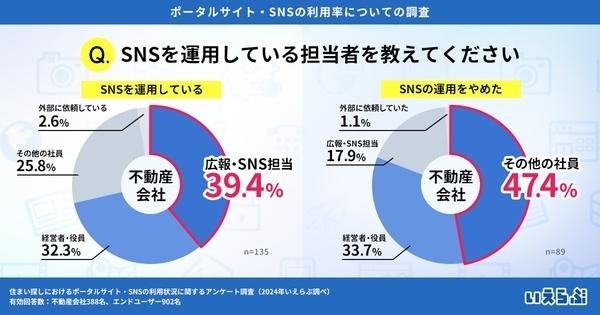 SNSを運用している不動産会社に担当者について尋ねたところ、39.4%が「広報・SNS担当社員」による運用という結果になりました。