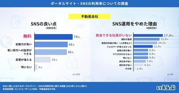 SNSを運用している不動産会社(※1)に「SNSの良い点」を尋ねたところ、「無料」(78人)という回答が最も多く、次いで「拡散力が高い」(68人)、「若い世代への訴求ができる」(66人)がTOP3回答となりました。