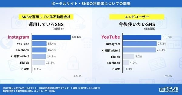 不動産会社が運用しているSNS第1位はInstagram、エンドユーザーが住まい探しに利用したいSNSはYouTubeが最多に|SNSの利用についてのアンケート調査 いえらぶGROUP