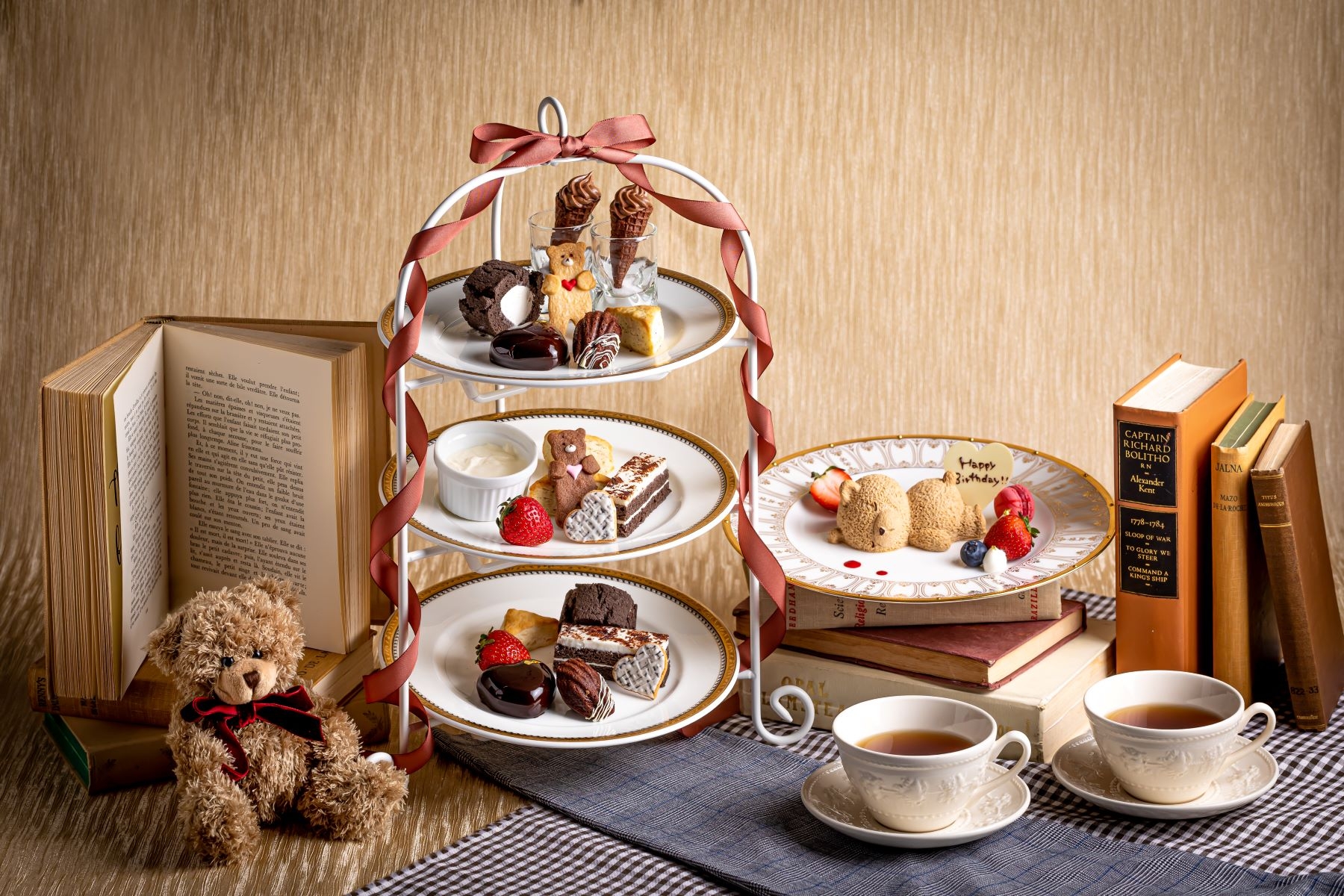 かわいいハートのチョコレートムース/ミニチョココーン/チョコレートのロールケーキ/ジェノワーズショコラケーキ/国産フレッシュいちご/グレンチェックのハートクッキー/ハートをかかえたテディベアクッキー/ショコラマドレーヌ/イングリッシュスコーン/自家製クロテッドクリーム