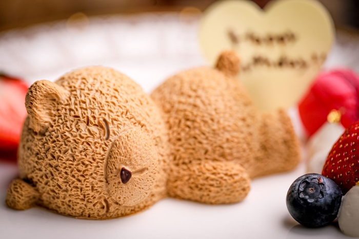 オプションの『スリーピングベアケーキ』は、“横になって寝ている、ゆるかわいいクマ”を表現。表面のショコラムースの中は“クレームバニーユ”と“クーリーフランボワーズ”で構成されており、2種類の味が楽しめるパティシエこだわりの一皿に。