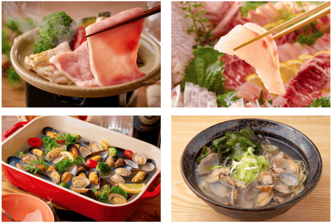 ◼️ 上段左:東の匠SPF豚の陶板焼き。白く甘みのある脂身と、歯切れが良く味わい深い赤身が絶妙にマッチする銘柄豚を、陶板焼きでお楽しみください。火を通し過ぎると身が固くなり、美味しさが逃げてしまうので、脂身に透明感が出てくる食べ頃をお見逃しなく。