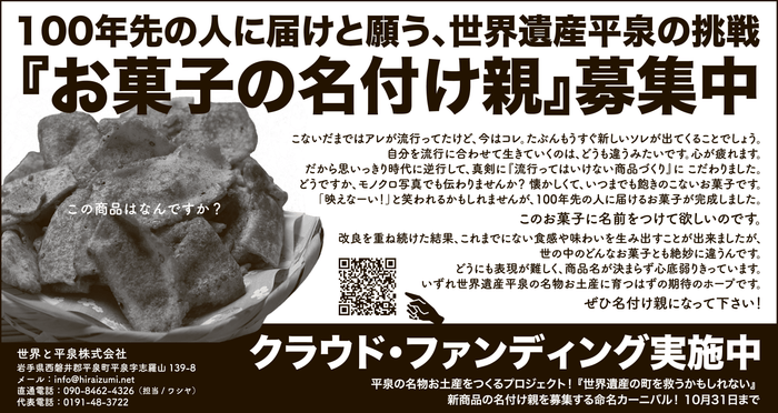 今回のプロジェクトは、クラウドファンディングを利用し、このやがて平泉の名物となる発売前のお菓子に、消費者から名前をつけてもらうものです。いわば社会貢献の大喜利。賞品は、世界遺産の町に名前を残すこと。