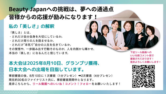 この度、”ビューティジャパン東京”というコンテストのファイナリストに選出いただき、8月の本大会に向け活動しています!