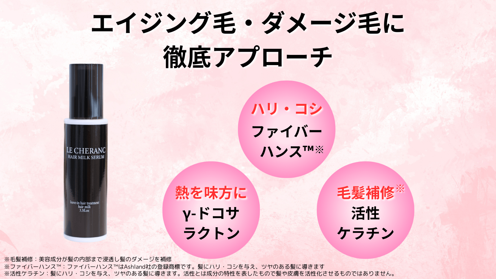 ファイバーハンス™、活性ケラチン、ナノ化γ-ドコサラクトン、セラミドなど、熱を味方にする補修成分を厳選配合。
