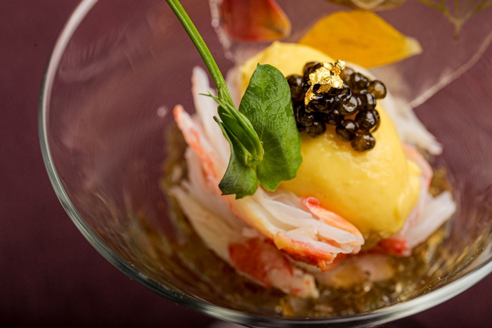 ・ズワイガニと甲殻類のジュレ とうもろこしのムース キャビア添え