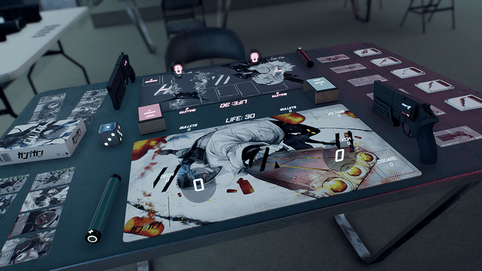 当ワールドは独自で開発したシステムを使用して制作され、VR上でも現実のように遊びやすく、カードやプレイマットの質感もリアルに再現。「銃を撃って相手の体力を減らす」「注射器で自分の体力を回復する」といったVRならではの要素も取り入れ、現実とはまた違った、没入感のある「未来のアナログゲーム体験」を実現しています。3月6日現在お気に入り登録1万5千人、毎日400人以上、累計15万人が訪れた大人気ワールドとなっています。